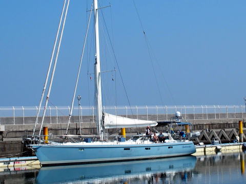 同国艇「DAWNBREAKER」が入港しましたが、淡輪ライフを楽しむ暇もなく、 翌日10時過ぎに「洲本で温泉に入る」と云って出港しまし た。 出港前に柿原さんと私が訪問して短い時間でしたが、いろいろ話をする事が出来ました。 同艇は全長20メートルのアルミ製、乗組みは艇長Lars(64歳)、Viola夫人(66)、