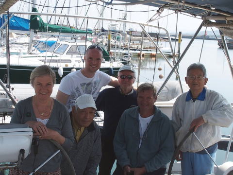 Uno(71)、Johan(33)の4名で、これから瀬戸内海、日本海を経て、アラスカに向かうとのことでした。途中先行の 「MOON」にも会う予定とのことで、渡し損なっていたムーンの写真を託しました。 |